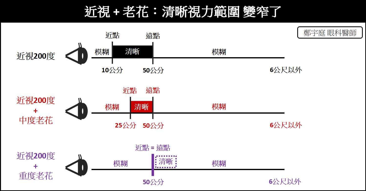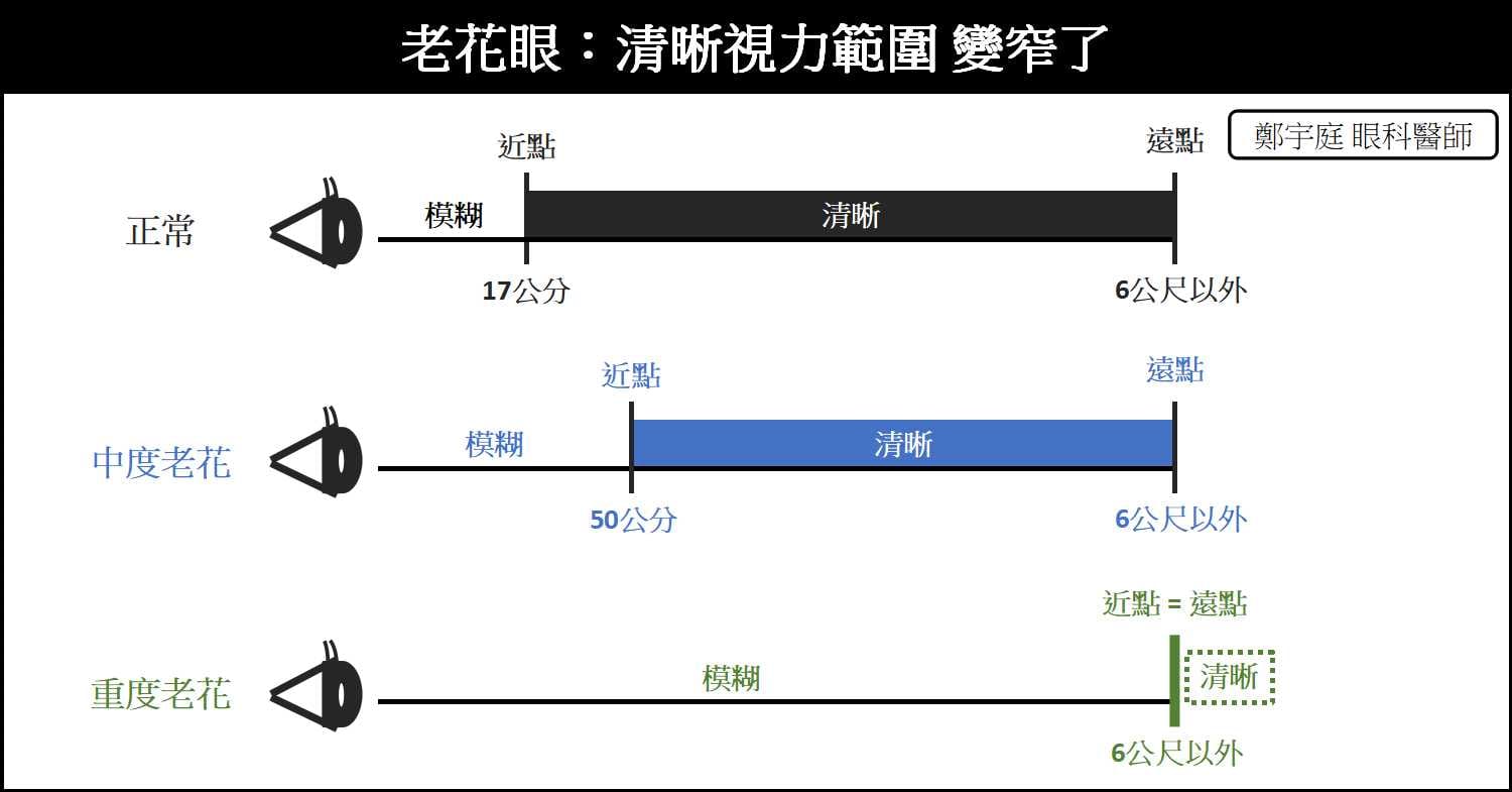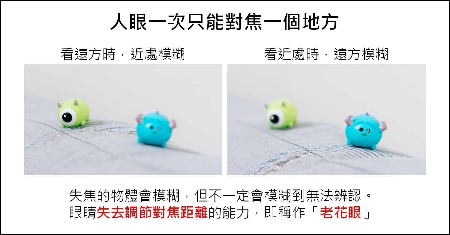 大家一定要分清楚,老花眼指的是「可對焦範圍縮小」。近視則是「看遠模糊」,這是完全不同的概念。
