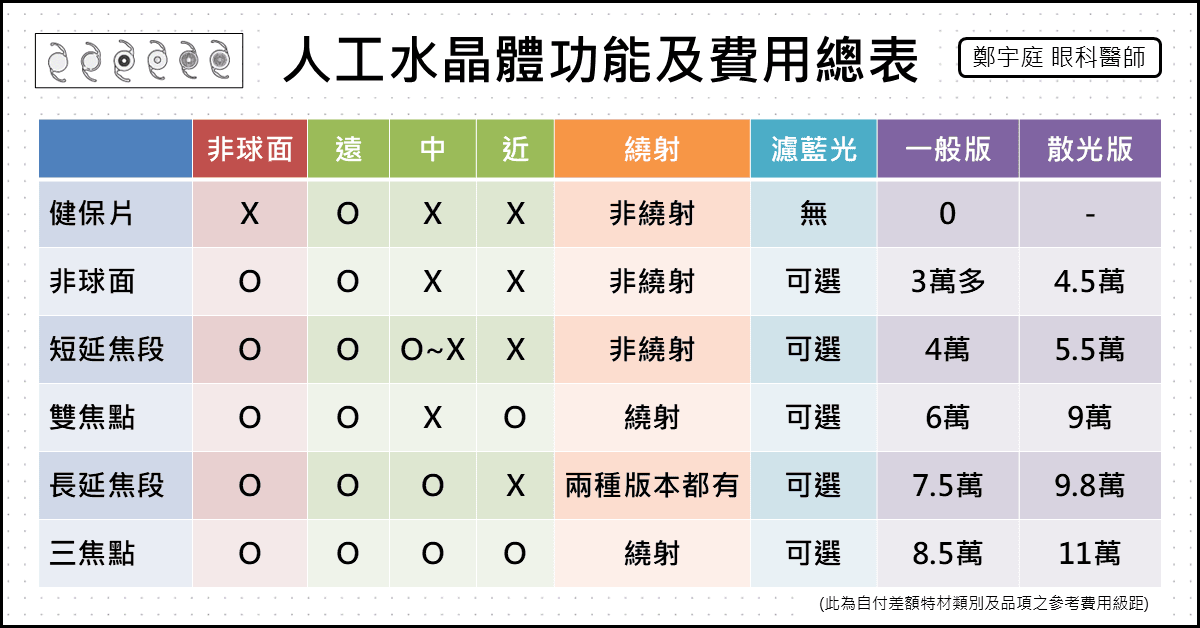 我在這裡把台灣目前市面上的所有人工水晶體的類別、功能、費用,整理成表格,提供給大家參考。