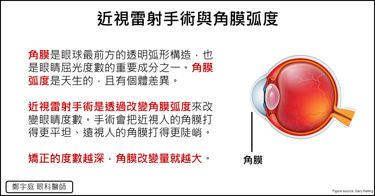 角膜是眼球最前方的透明弧形構造,是眼睛屈光度數的重要成分之一。角膜弧度是天生的,且有個體差異。近視雷射手術的原理是透過改變角膜弧度來改變眼睛度數。雷射手術會把近視人的角膜打得更平坦、遠視人的角膜打得更陡峭。矯正的度數越深,角膜的改變量就越大。