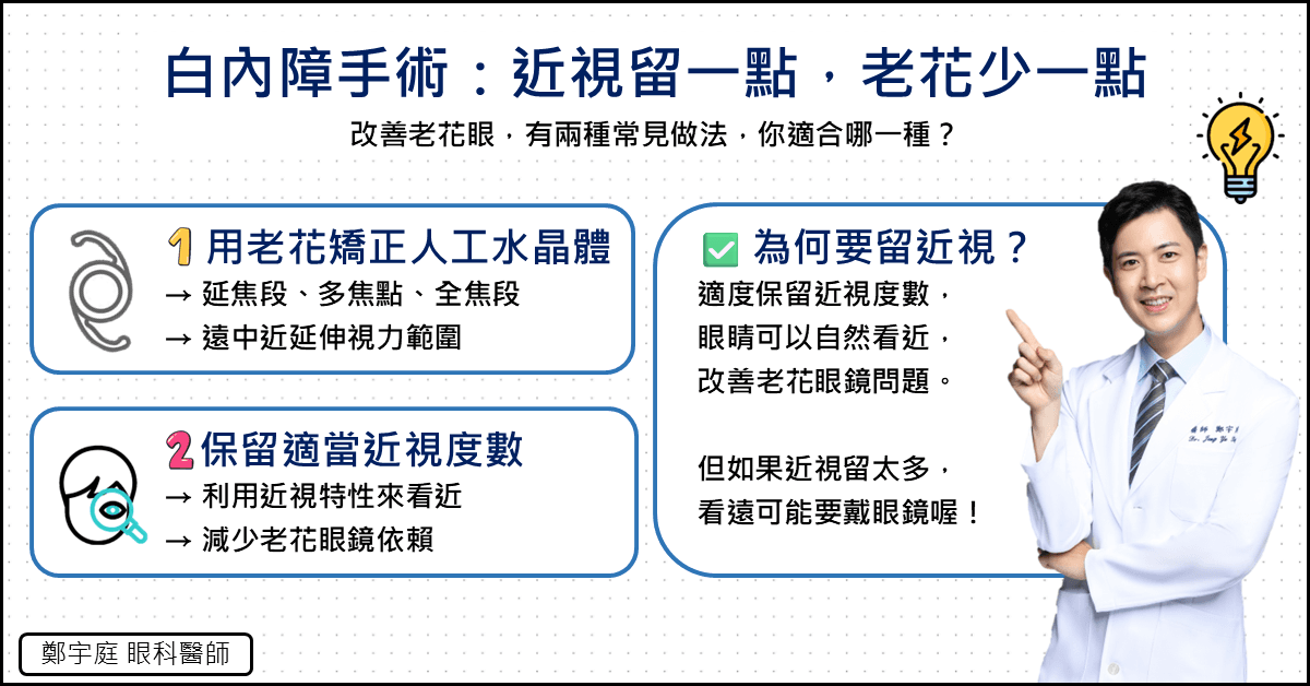 - 使用老花矯正型人工水晶體:如多焦點(雙焦點、三焦點)、長延焦段等,延伸視力範圍。