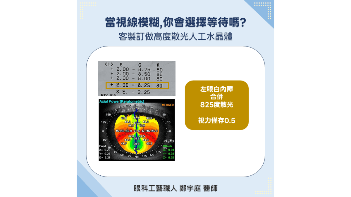 一位只剩一隻眼睛可見的病患,面臨高達 800 度散光與白內障的雙重挑戰。透過客製化高散光人工水晶體,他重新看見清晰世界。本篇分享白內障合併高散光的手術關鍵與希望重現的故事。