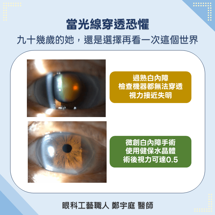白內障「過熟」代表水晶體變得非常堅硬、混濁,手術過程不僅難度高,也更容易產生併發症。對醫師而言,是一場技術與耐心的考驗;對病人而言,更是一場對未知的勇氣。