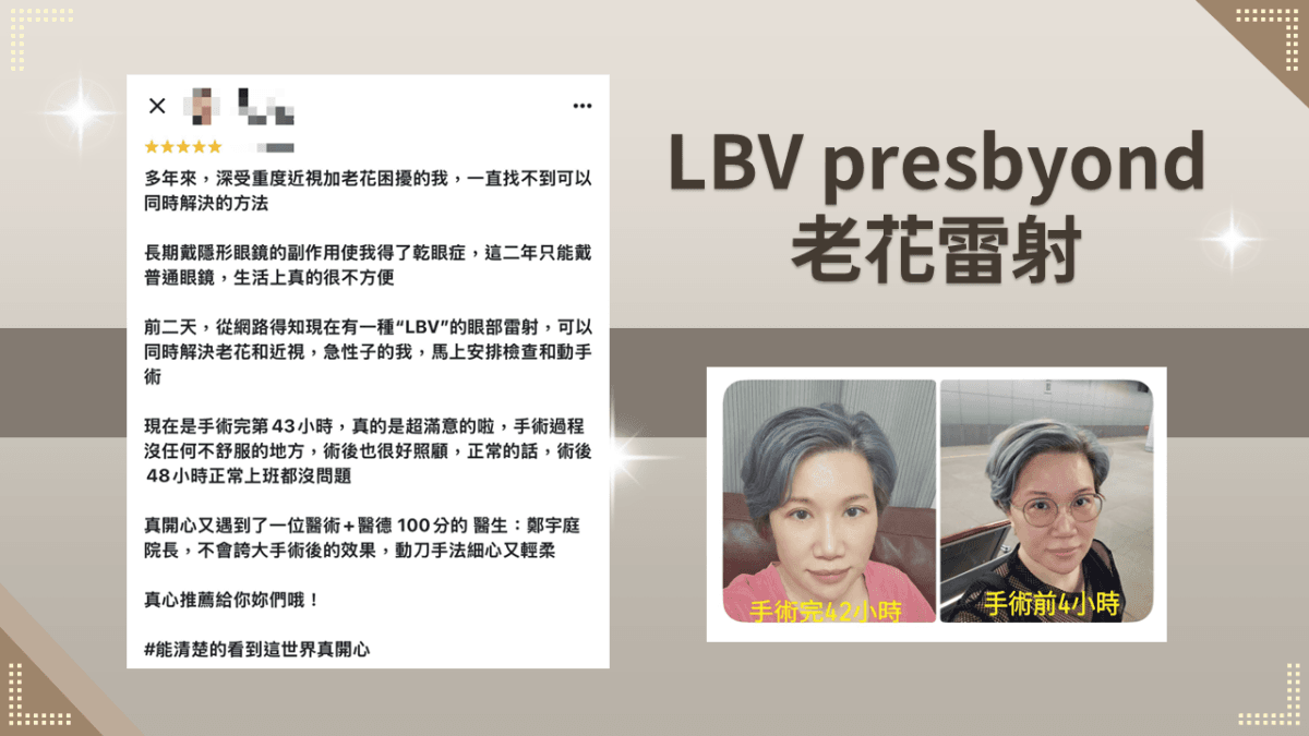 前二天,從網路得知現在有一種“LBV”的眼部雷射,可以同時解決老花和近視,急性子的我,馬上安排檢查和動手術