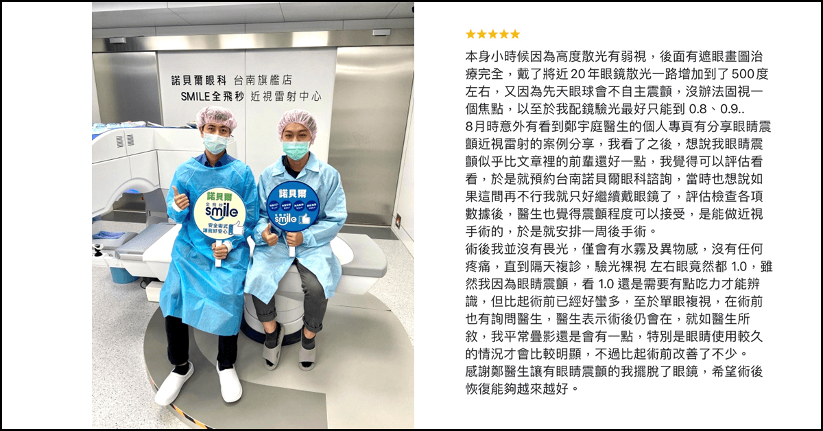 8月時意外有看到鄭宇庭醫生的個人專頁有分享眼睛震顫近視雷射的案例分享,我看了之後,想說我眼睛震顫似乎比文章裡的前輩還好一點,我覺得可以評估看看,於是就預約台南諾貝爾眼科諮詢,當時也想說如果這間再不行我就只好繼續戴眼鏡了,評估檢查各項數據後,醫生也覺得震顫程度可以接受,是能做近視手術的,於是就安排一周後手術。