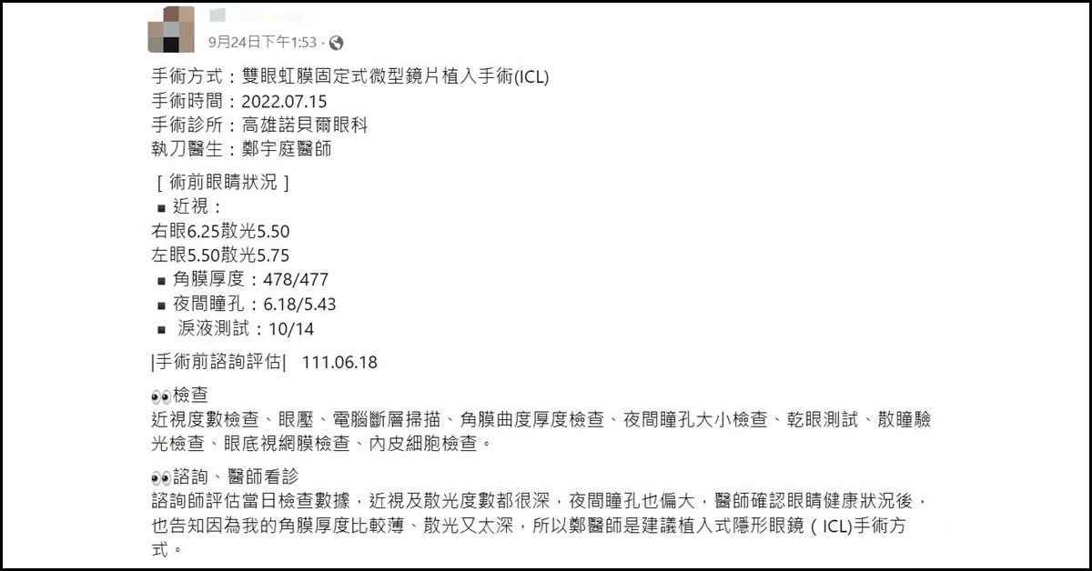 諮詢師評估當日檢查數據,近視及散光度數都很深,夜間瞳孔也偏大,醫師確認眼睛健康狀況後,也告知因為我的角膜厚度比較薄、散光又太深,所以鄭醫師是建議植入式隱形眼鏡(ICL)手術方式。