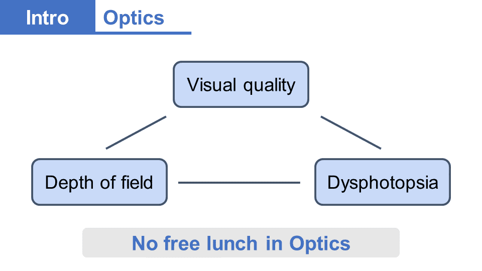 但就如同孫悟空翻不出如來佛的五指山,人工水晶體的老花矯正設計,也無法突破光學鐵三角的物理限制:視覺清晰度、景深、光學干擾(夜間眩光)。