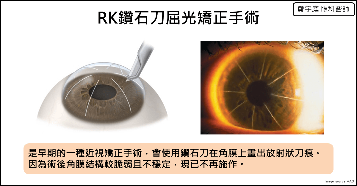 RK鑽石刀屈光矯正手術,是早期的一種近視矯正手術。使用鑽石刀在角膜上畫出放射狀的刀痕,一般來說是畫8刀。深度大約是角膜整層厚度的80~90%。如此來改變角膜的屈光力,進而矯正眼睛度數。
