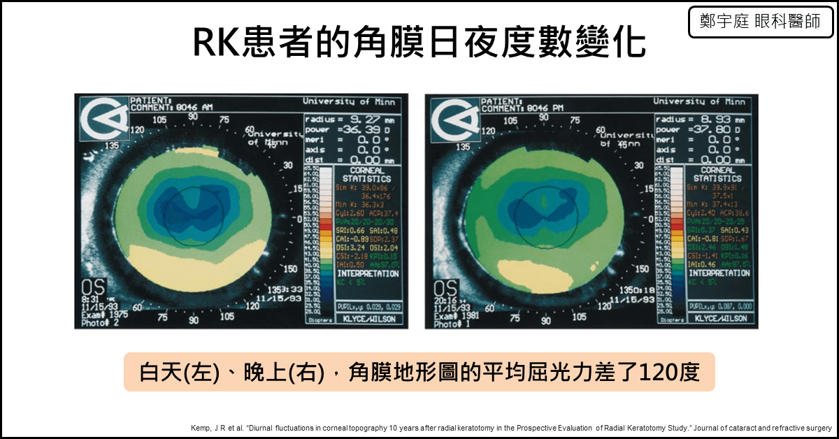 這種RK日夜的角膜弧度變化,造成了一整天下來眼睛度數在發生變化,也同時影響到人工水晶體的度數選擇。