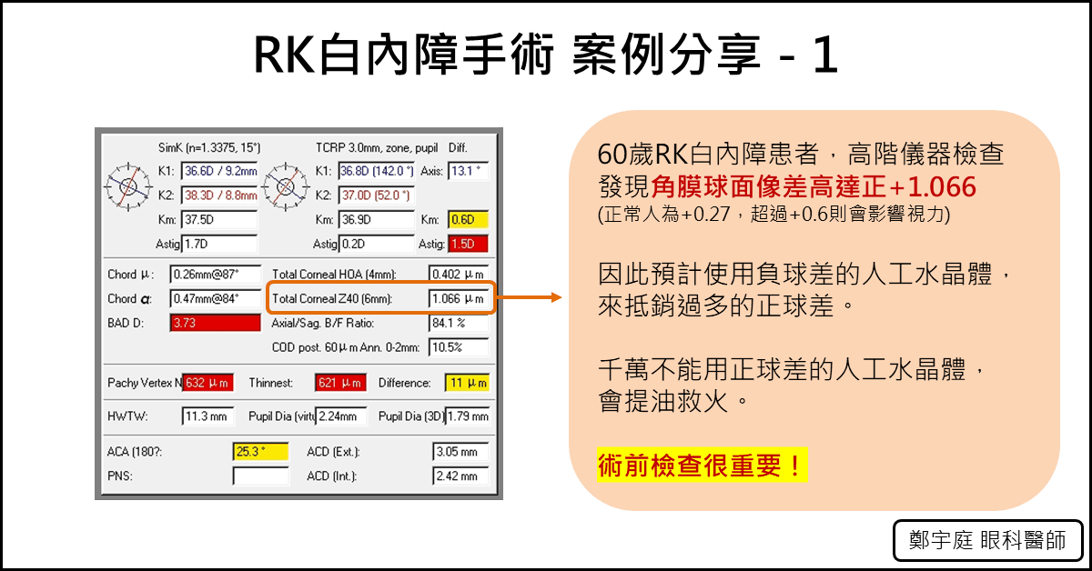 需要注意的是,在此案例中,我們必須避免使用正球面像差設計的人工水晶體。因為這樣會提油救火,惡化眼睛的高階像差情況,影響術後視力。術前的高階儀器檢查,很重要。